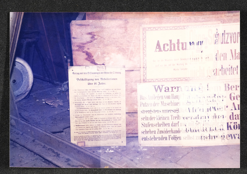 Warnschilder über Arbeit an Maschinen und Auszug aus den Bestimmungen der Gewerbe-Ordnung über die Beschäftigung von Arbeiterinnen über 16 Jahre. Foto vom März 1986 aus einer Firma. Nähere Daten nicht bekannt.