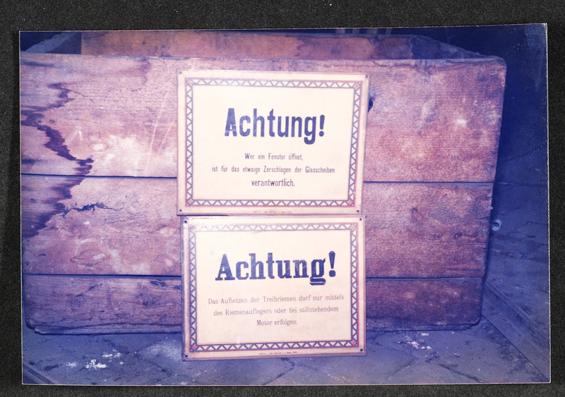 Warnschilder über das Öffnen von Fenstern und das Aufsetzen der Treibriemen. Foto vom März 1986 aus einer Firma. Nähere Daten nicht bekannt.