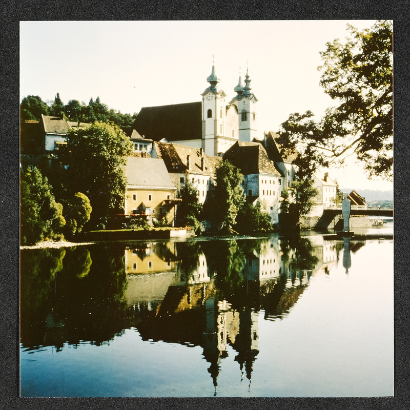 Ansicht von Steyr, Blick vom rechten Ennsufer zum Ortskai, Bürgerspital und Michaelerkirche
