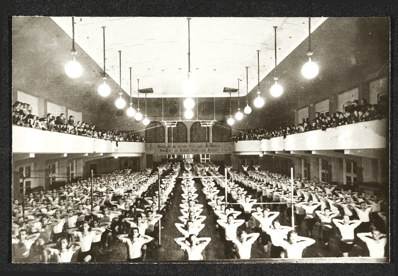 Turnveranstaltung von Männern in einem großen Saal vor Zuschauern und Zuschauerinnen in der Galerie