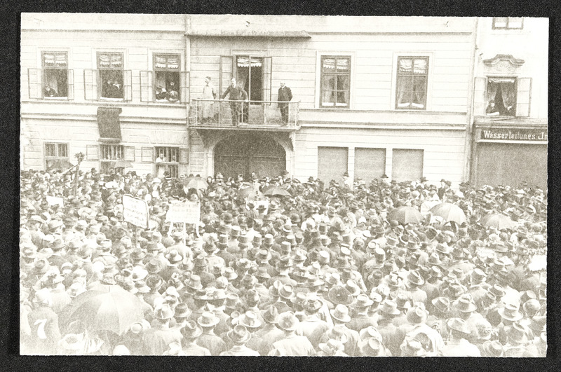 1. Mai Feier in Oberösterreich, Redner am Balkon und unterhalb die Menschenmenge
