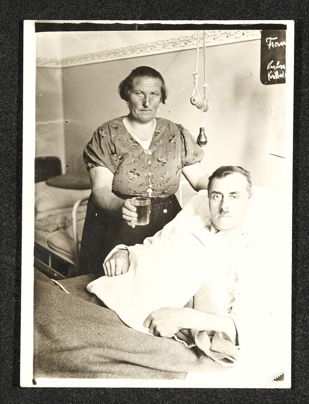 Franz Valenta im Spitalbett daneben steht eine Frau mit einem Trinkglas, er verstarb an seinen Verletzungen am 1. Juli 1934