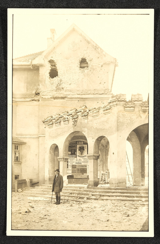 Zerstörungen auf der Ennsleite, zerstörrte Hausansicht, Mann mit einem Gehstock vor den Treppen