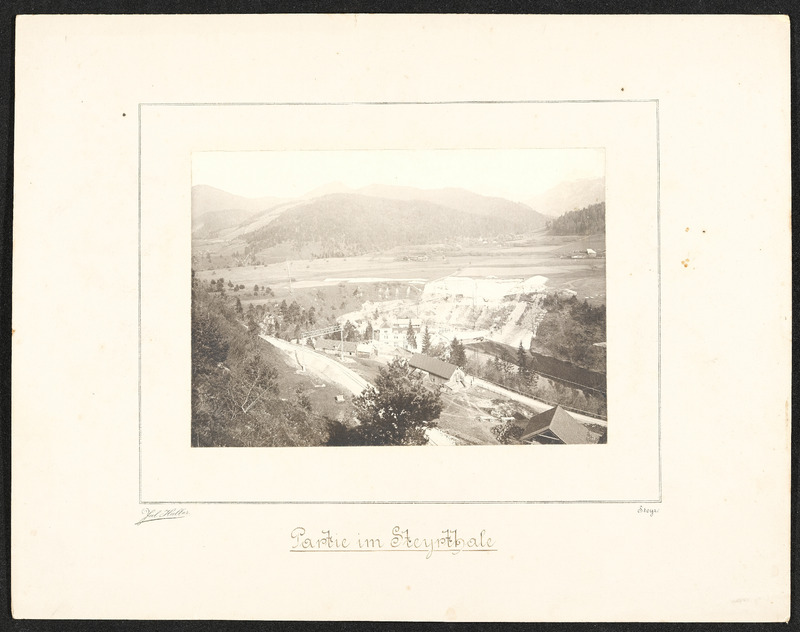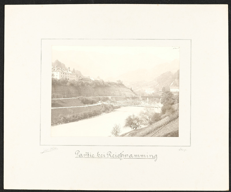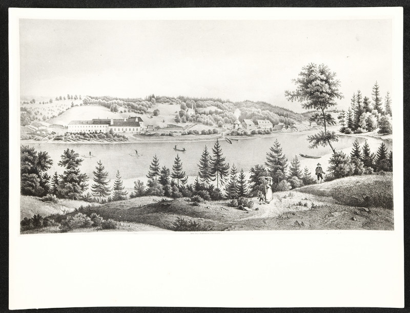 Lithographie der Sägemühle in Letten von Ferdinand Krackowizer. Die Sägemühle wird 1844 von Leopold Werndl gekauft und durch Zu- und Umbauten zur ersten Fabrik der Österreichischen Waffenfabriks-Gesellschaft Steyr.