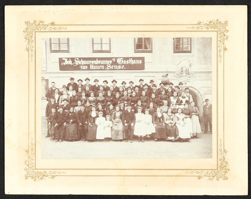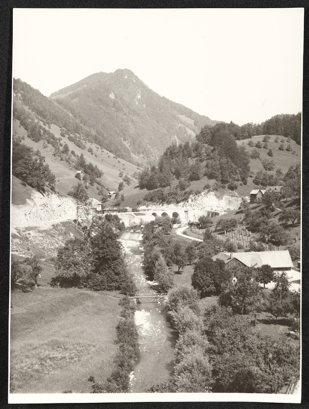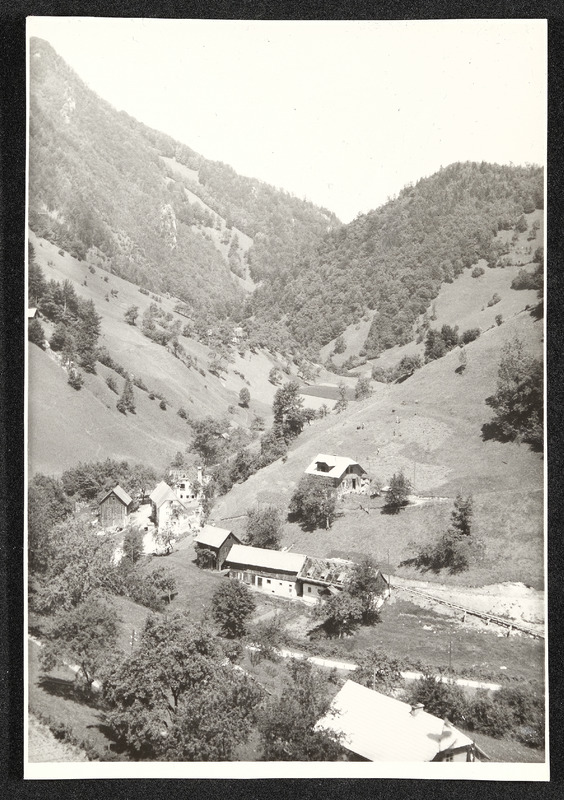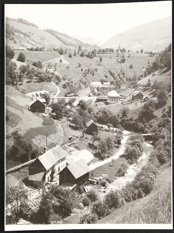 Blick aus dem Pechgraben auf Großraming, Neustiftgraben, Pechgrabenbrücke, Alt- und Ersatzbau Bürscher und Ersatzbau Katzensteiner Altbau. Aufnahme vom 1. Juni 1949.