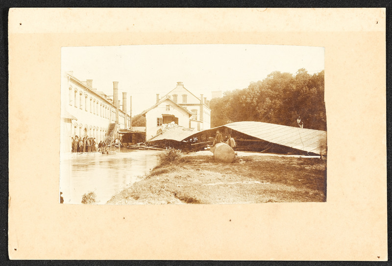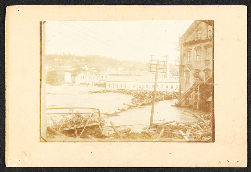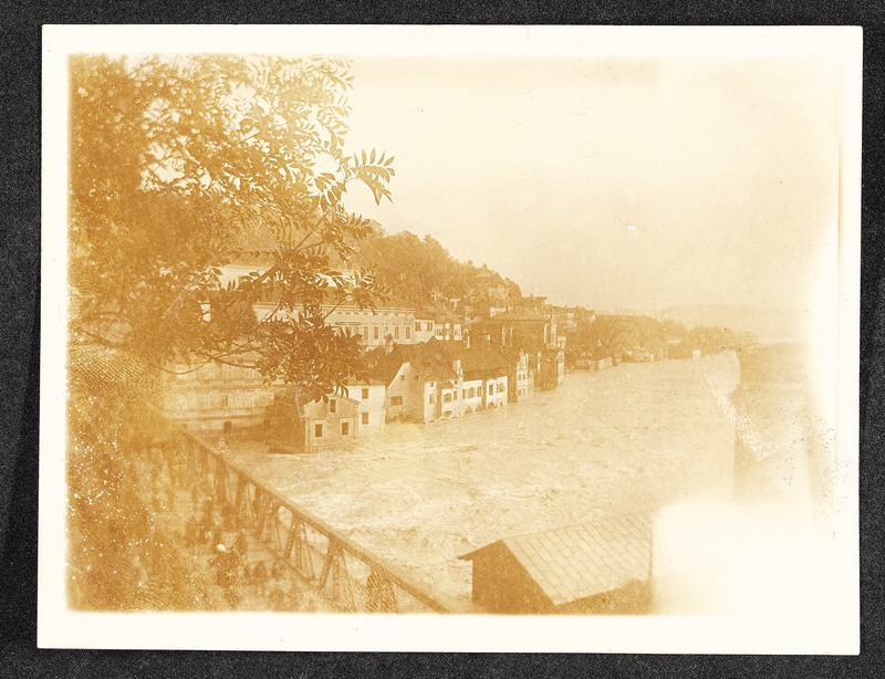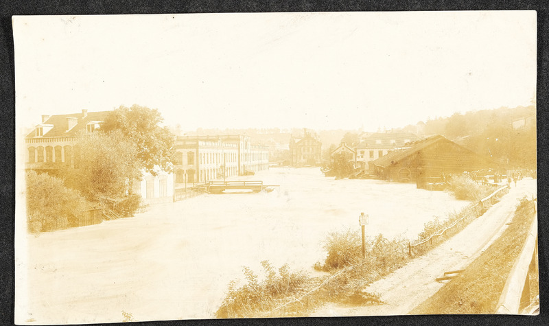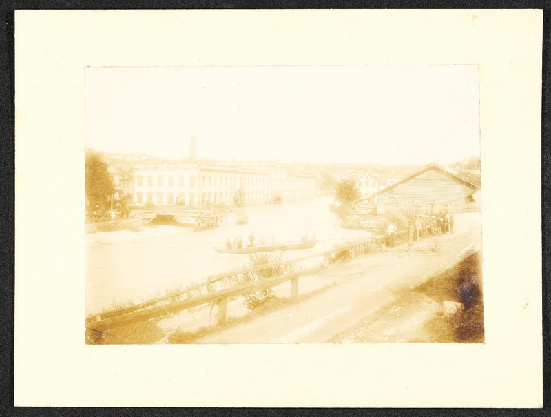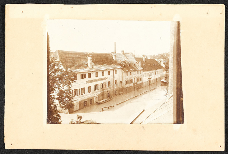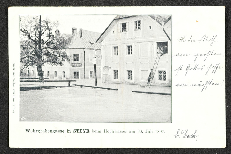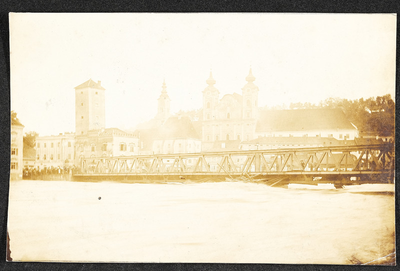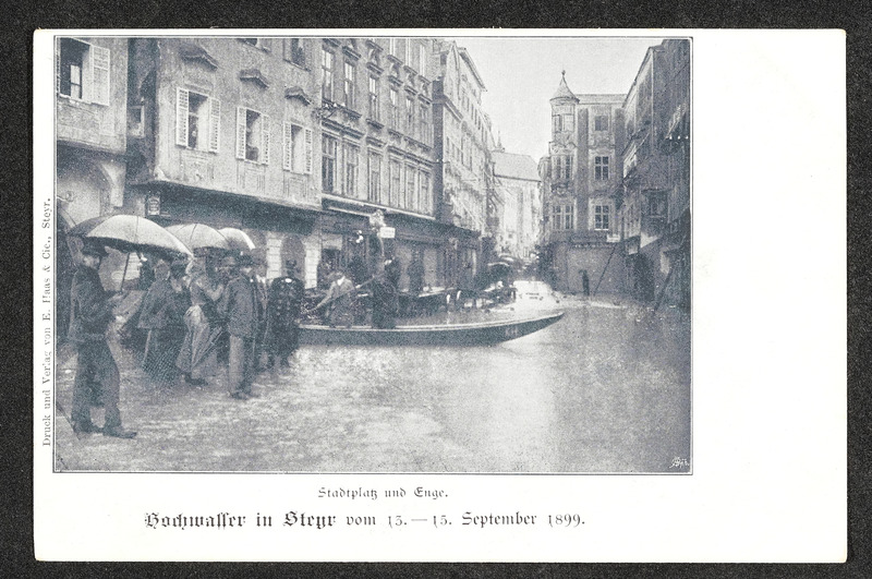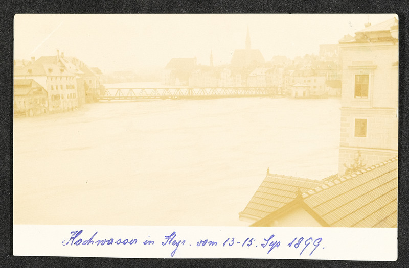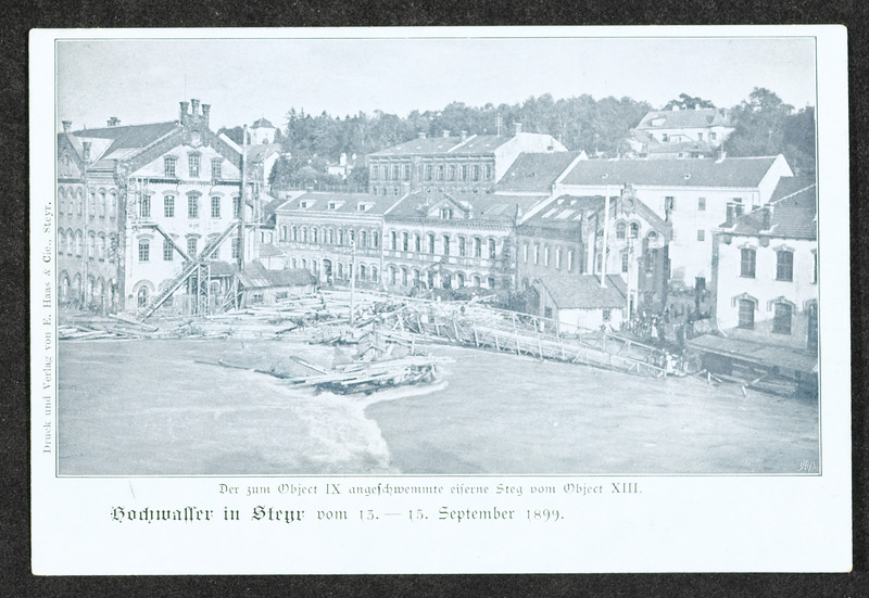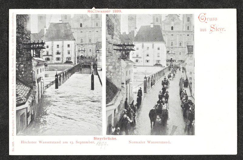 Hochwasser am 13. und 14. September 1899 in Steyr. Zwei Fotos zeigen den Unterschied zwischen höchstem (am 13. bzw. 14. September 1899) und normalem Wasserstand bei der Steyrbrücke.