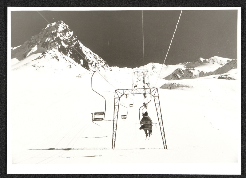 Skifahrer von hinten auf einem Sessellift bei der Bergfahrt