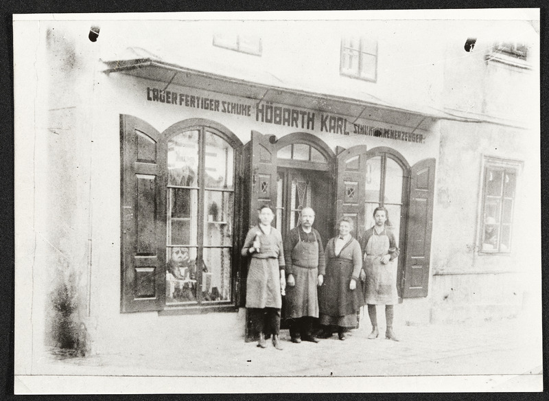 Schustermeister mit Frau, flankiert von zwei Lehrlingen vor dem Schuhgeschäft Höbarth