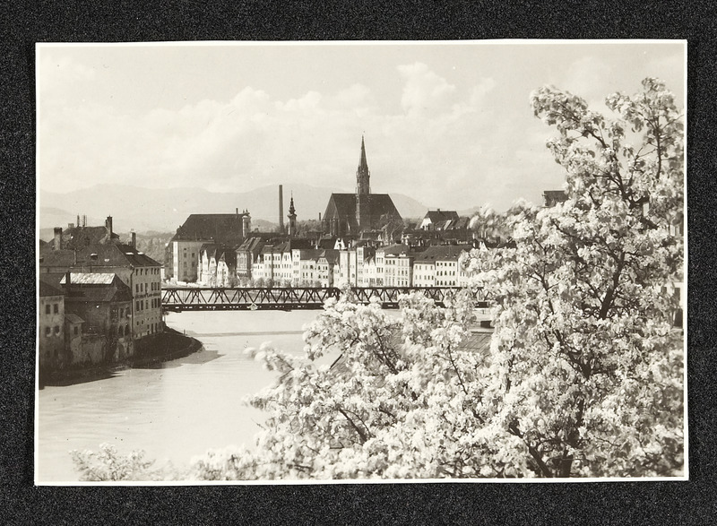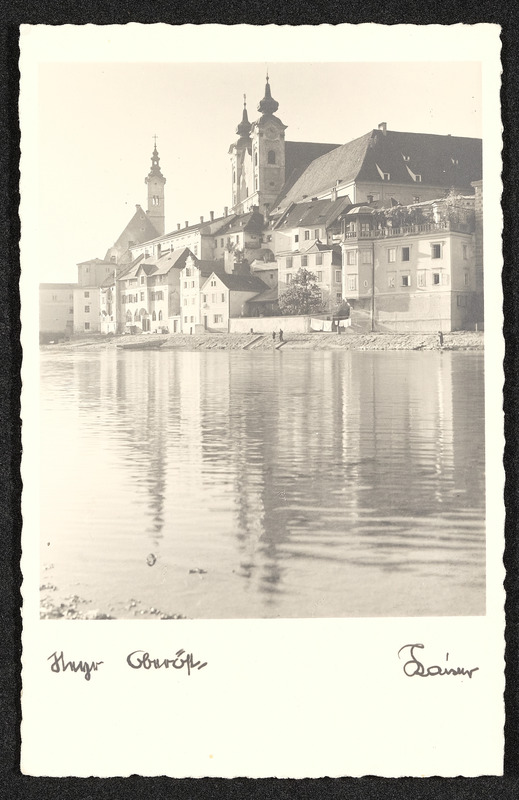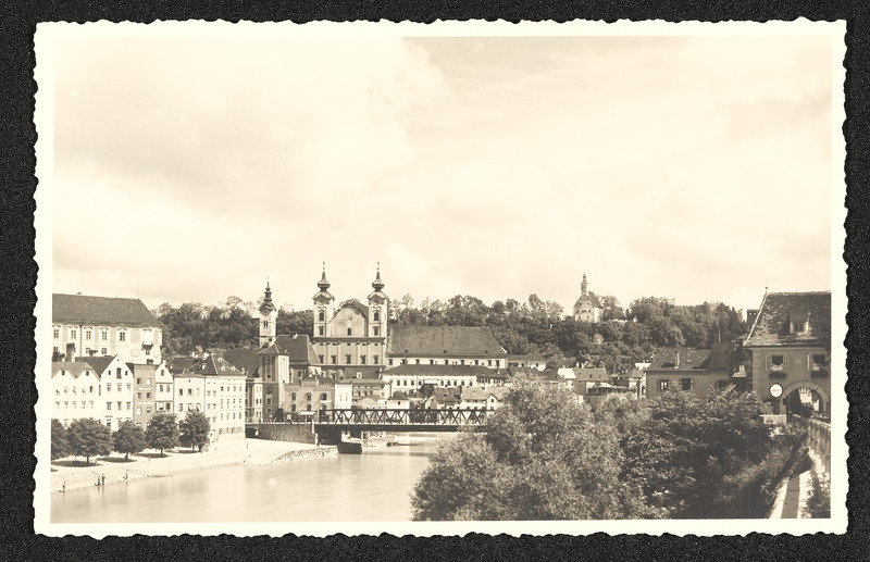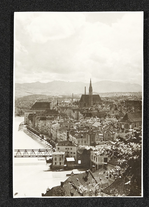 Blick von der Dukartstraße auf Kollertor, Michaelerkirche, Tabor, Zwischenbrücken, Ennskai und Schloss Lamberg