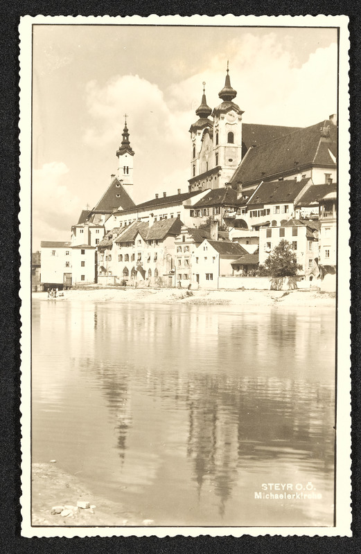Blick vom Wehrgraben über den Steyr-Fluss auf Teil der Hack-Werke, Bürgerspital und Michaelerkirche