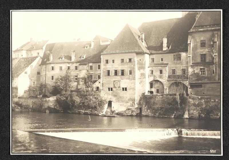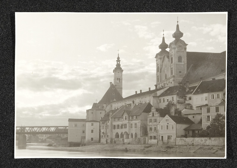 Blick von der Steyr-Brücke über Wehranlage gegen Steyrdorf mit Bürgerspital und Häuser in der Badgasse