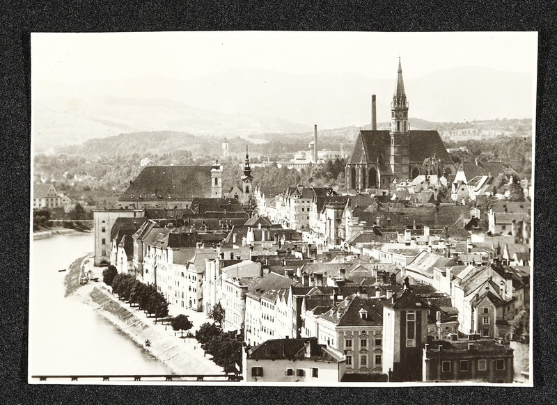 Berggasse mit Blick auf Enns, den Stadtteil Ennsdorf und das alte Werndl'sche Elektrizitätswerk, links im Bild das Schloss Lamberg