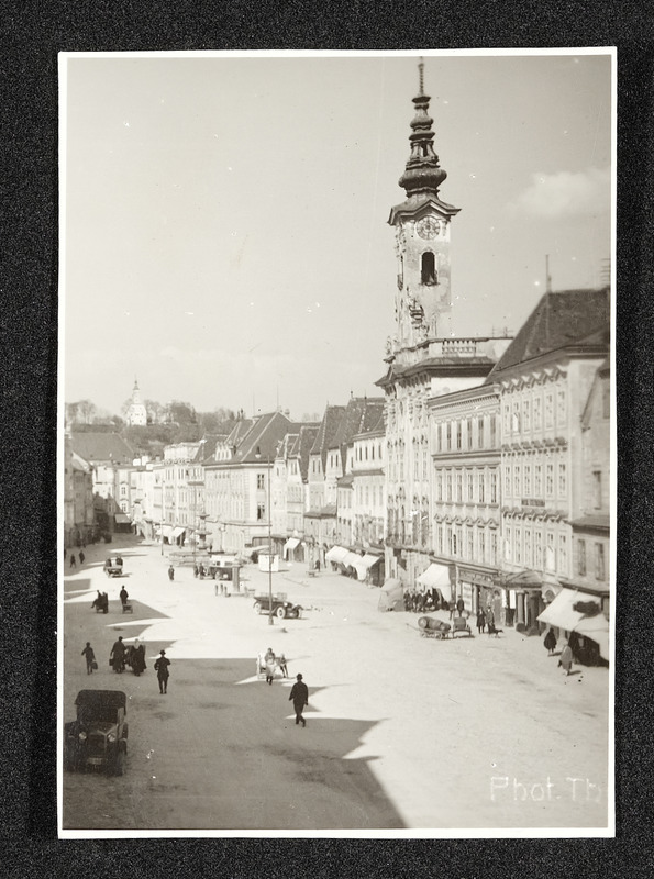 Ansicht vom Stadtplatz in Steyr mit Rathaus, zwei Automobilen und Handwagen