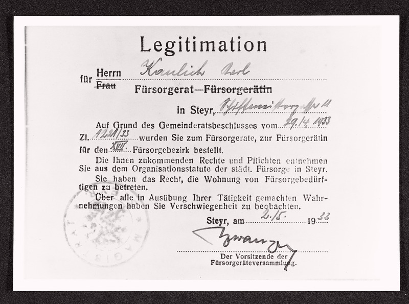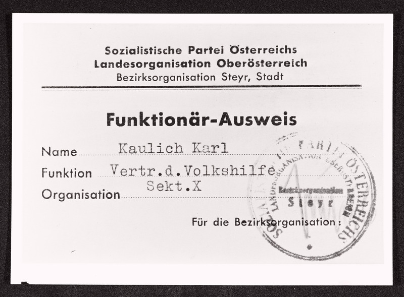 Funktionär-Ausweis (Repro) von Karl Kaulich, Vertreter der Volkshilfe, Sozialistische Partei Österreichs, Landesorganisation Oberösterreich, Bezirksorganisation Steyr Stadt