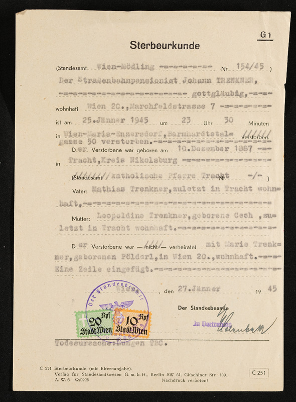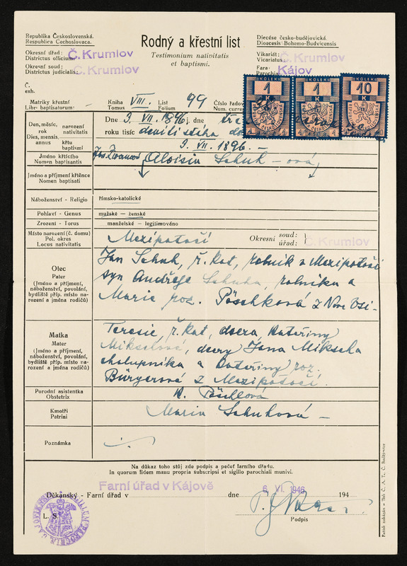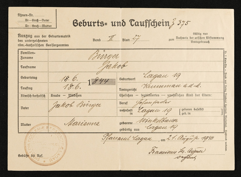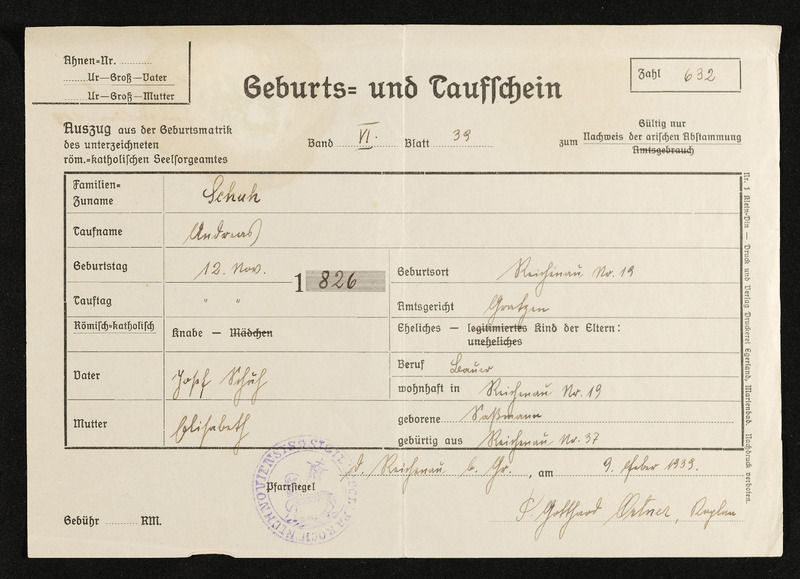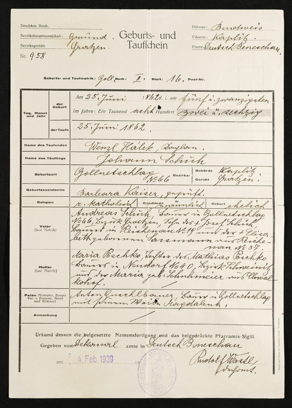 Geburts- und Taufschein, Johann Schuh, geboren am 25. Juni 1862 in Deutsch-Beneschau, ausgesetllt von der Bezirkshauptmannschaft Gmünd, Deutsches Reich, am 4. Februar 1939
