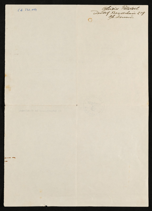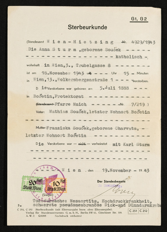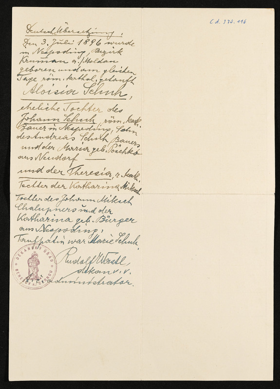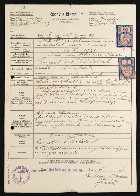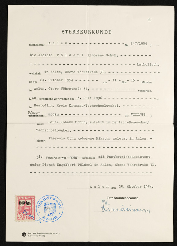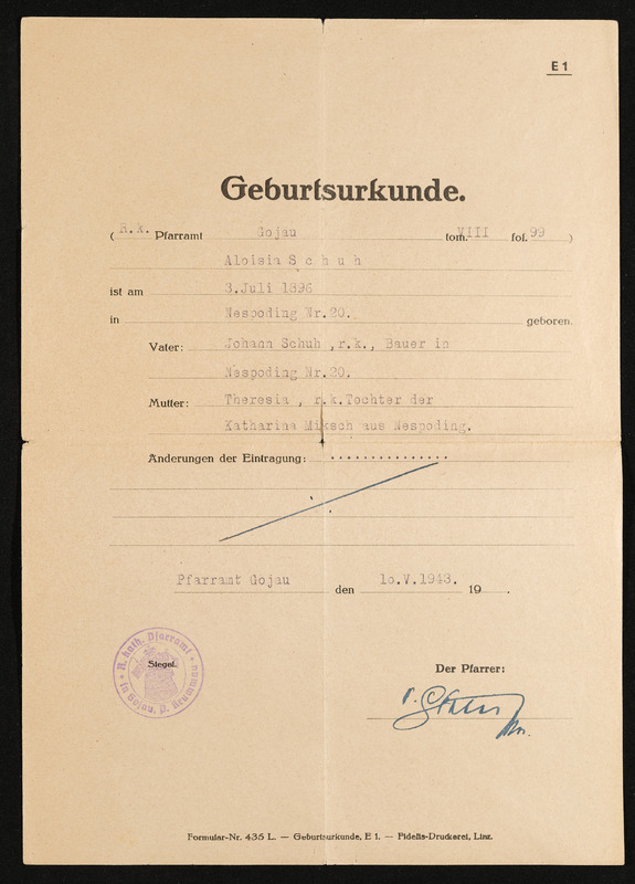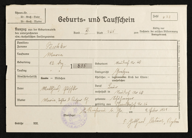 Geburts- und Taufschein Maria Pöschko, geboren am 12. Dezember 1835, ausgestellt in Deutsch-Beneschau am 9. Februar 1939, Vermerk Aloisia Pölderl, Deutsch-Beneschau 219