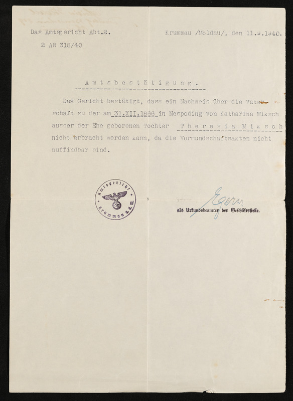 Amtsbestätigung, Nachweis über Vaterschft kann nicht erbracht werden, Vormundschaftsakten nicht auffindbar, Mutter: Katharina Miksch, Tochter: Theresia Miksch, Amtsgericht Krumau, 11. September1940