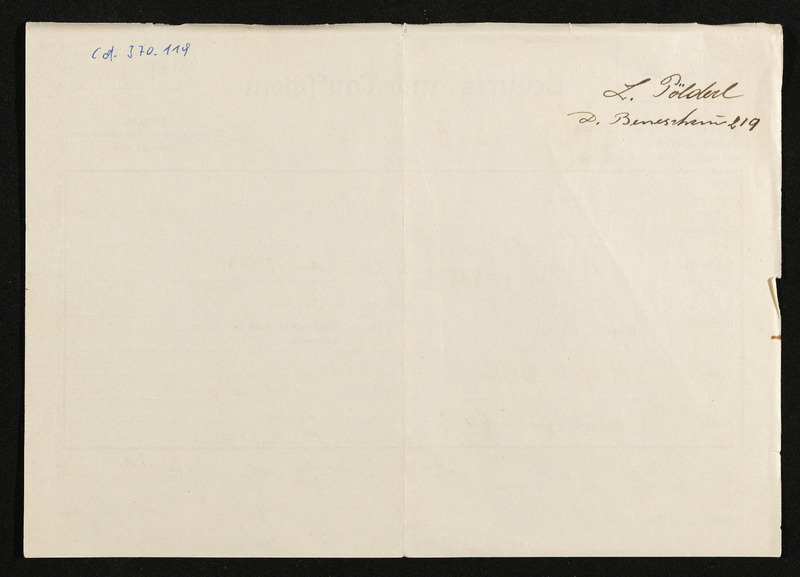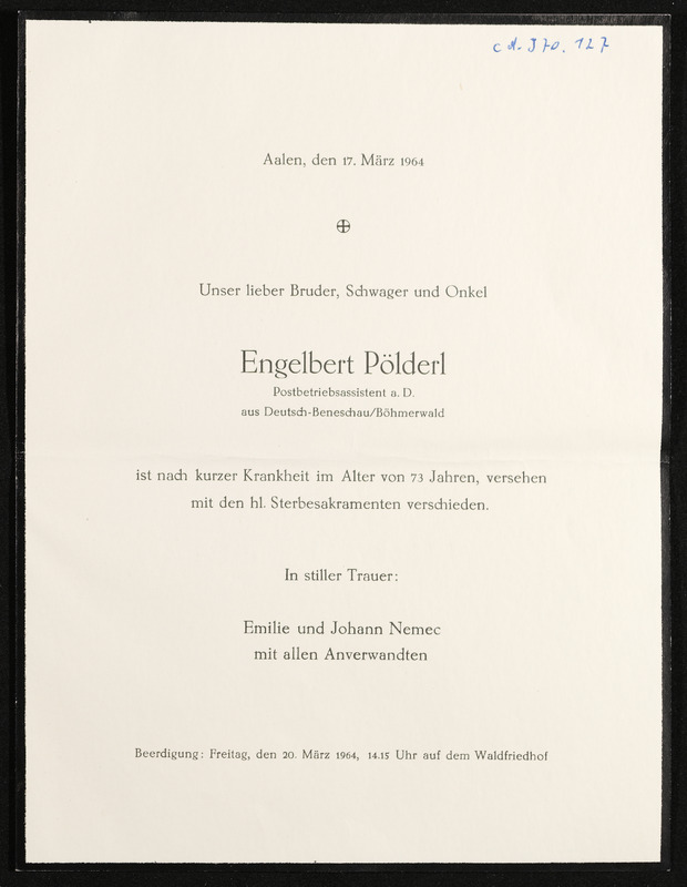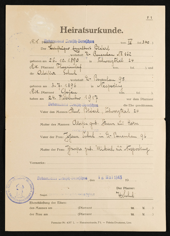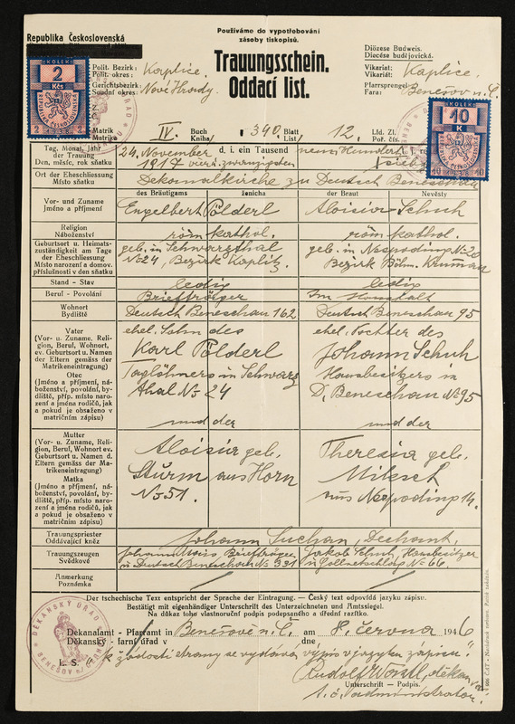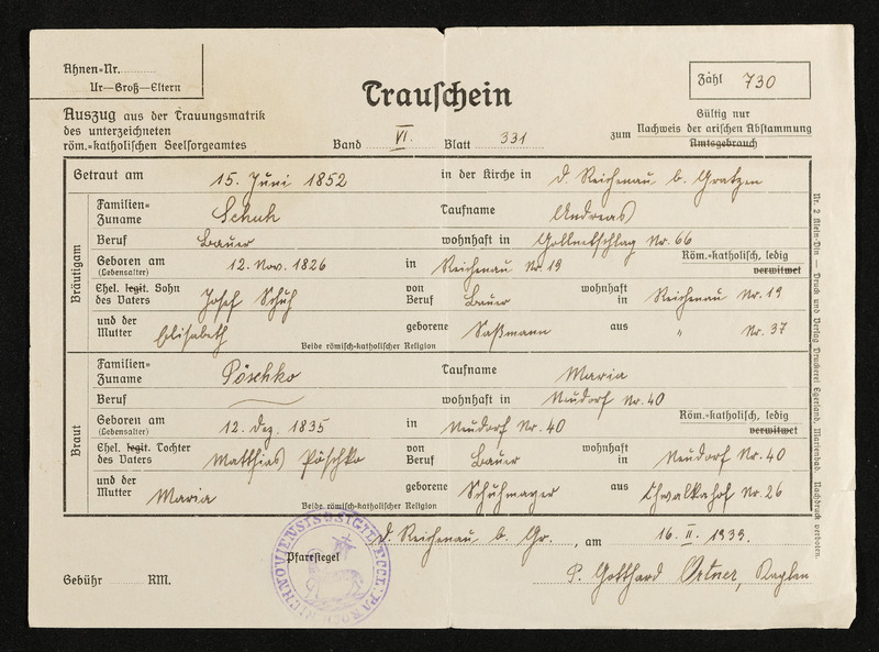 Trauschein Andreas Schuh und Maria Pöschko, Trauung am 15. Juni 1852, ausgestellt in Deutsch-Beneschau, am 16. Februar 1939, Vermerk Aloisia Pölderl, Deutsch-Beneschau 219