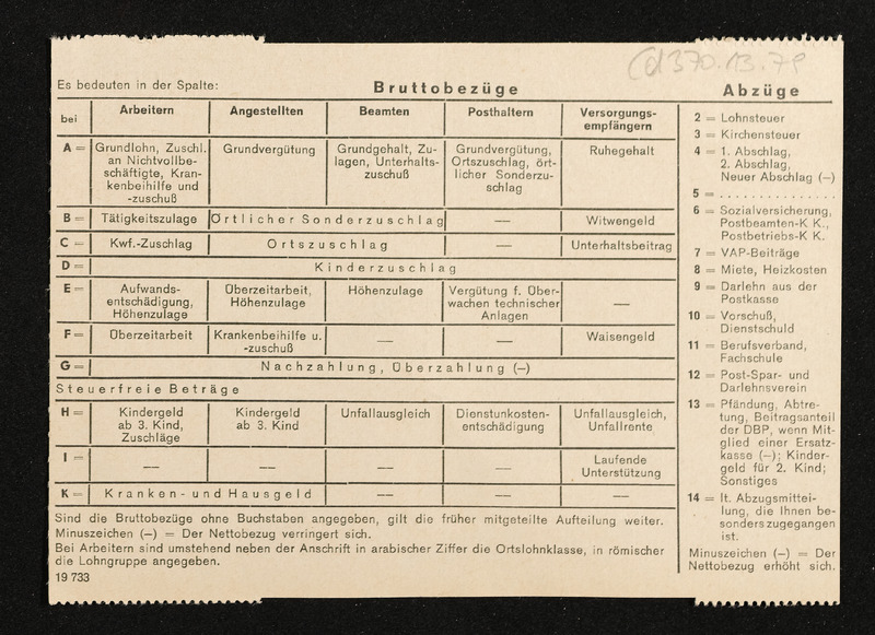 Lohnzettel, Postbetriebsassistent Engelbert Pölderl, Oberpostdirektion Stuttgart, April 1963