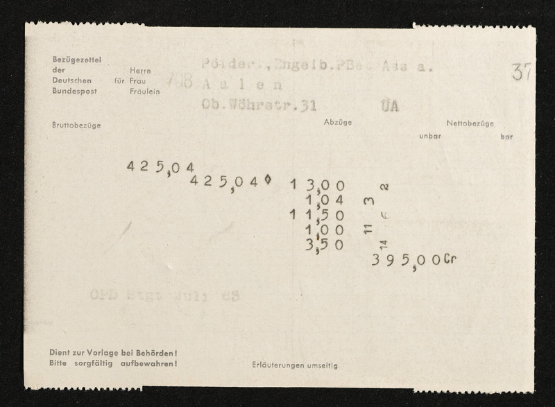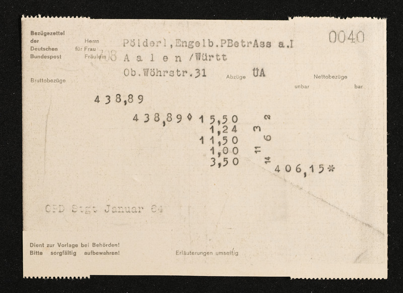 Lohnzettel, Postbetriebsassistent Engelbert Pölderl, Oberpostdirektion Stuttgart, Jänner 1964