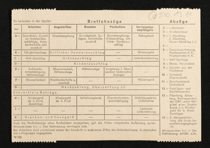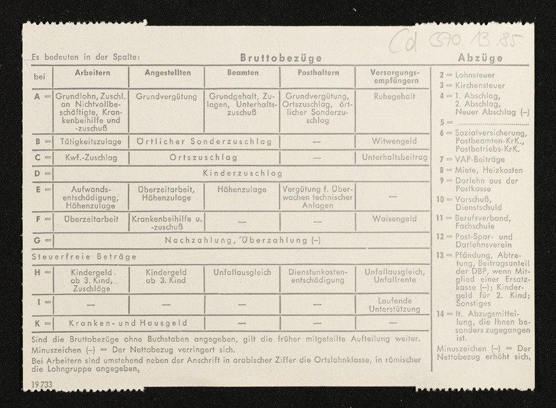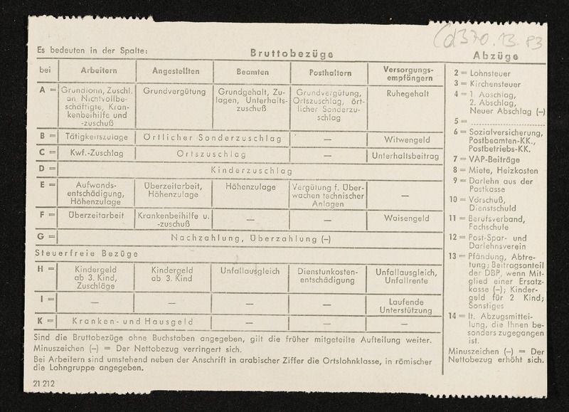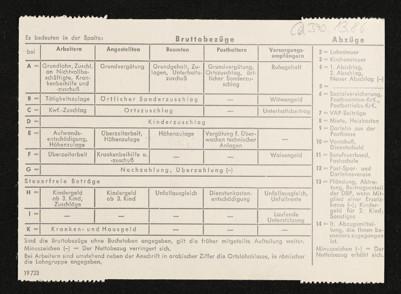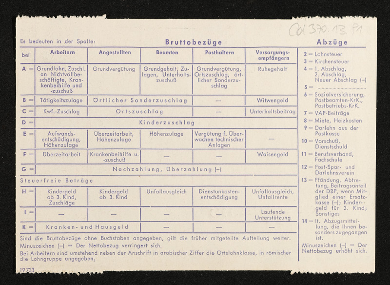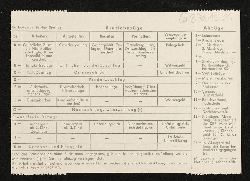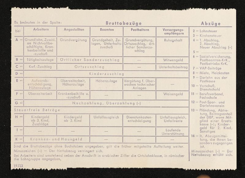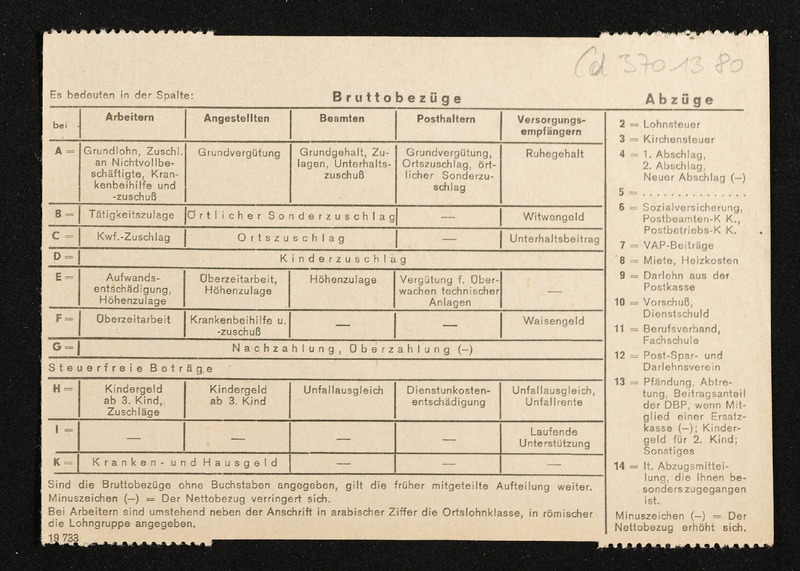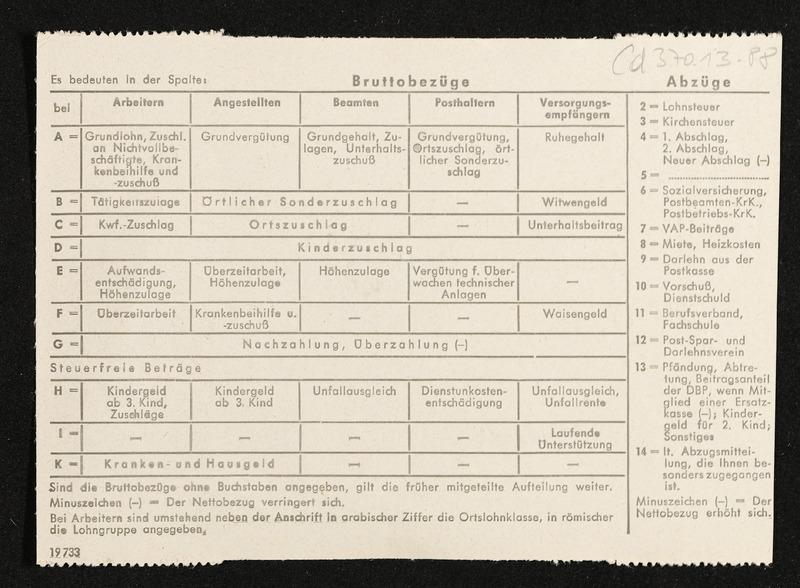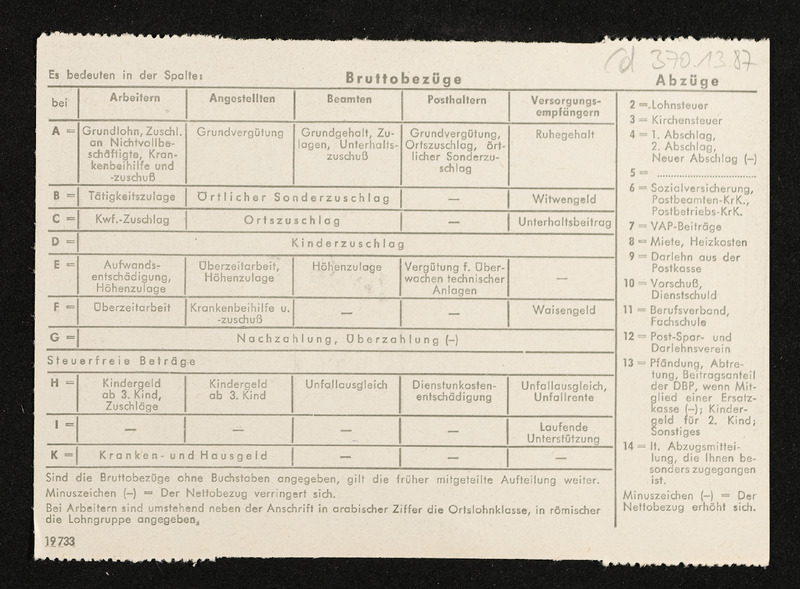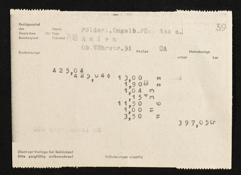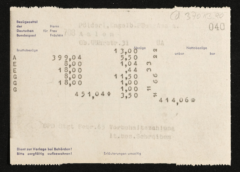 Lohnzettel, Postbetriebsassistent Engelbert Pölderl, Oberpostdirektion Stuttgart, Jänner 1963