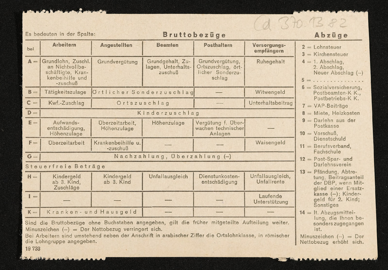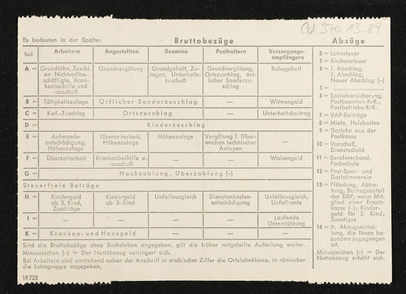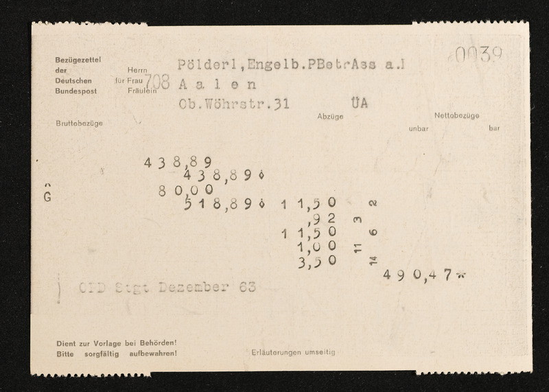 Lohnzettel, Postbetriebsassistent Engelbert Pölderl, Oberpostdirektion Stuttgart, Dezember 1963