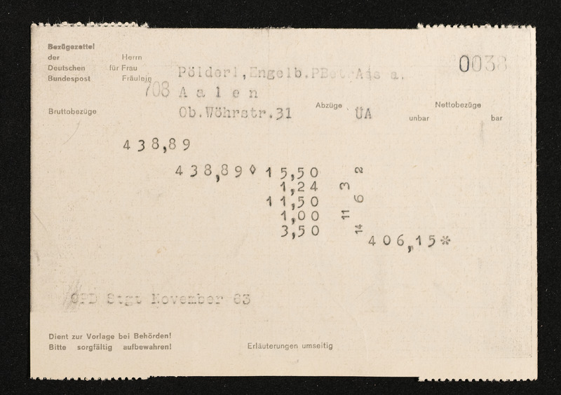 Lohnzettel, Postbetriebsassistent Engelbert Pölderl, Oberpostdirektion Stuttgart, November 1963
