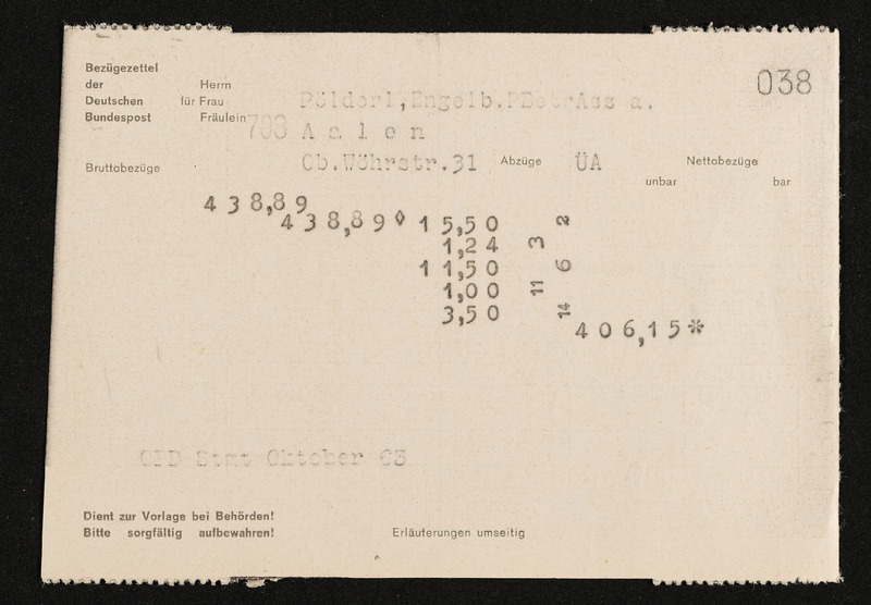 Lohnzettel, Postbetriebsassistent Engelbert Pölderl, Oberpostdirektion Stuttgart, Oktober 1963