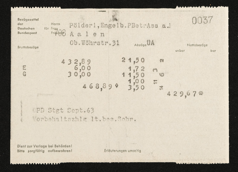 Lohnzettel, Postbetriebsassistent Engelbert Pölderl, Oberpostdirektion Stuttgart, September 1963