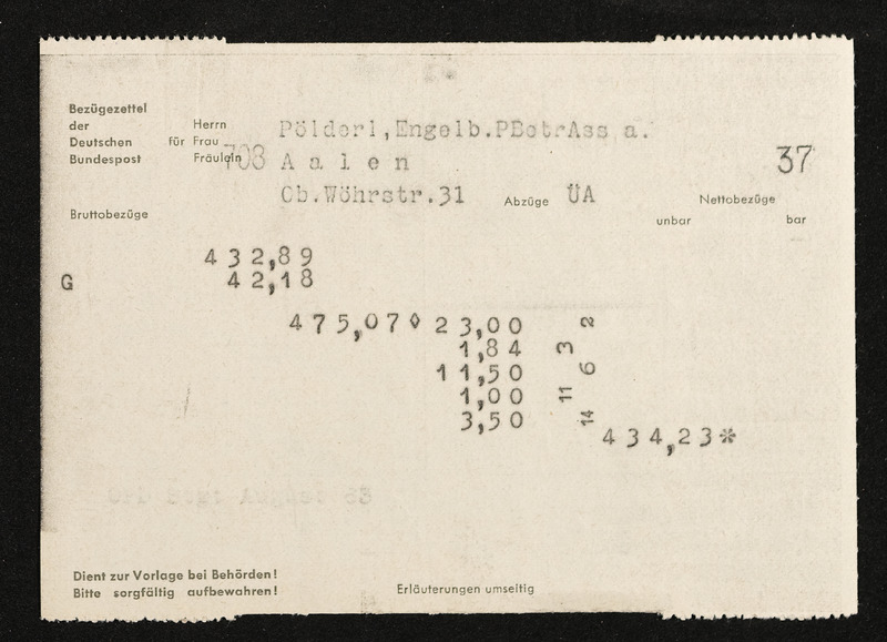 Lohnzettel, Postbetriebsassistent Engelbert Pölderl, Oberpostdirektion Stuttgart, August 1963