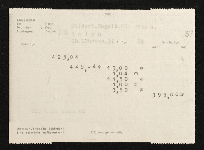 Lohnzettel, Postbetriebsassistent Engelbert Pölderl, Oberpostdirektion Stuttgart, Juni 1963