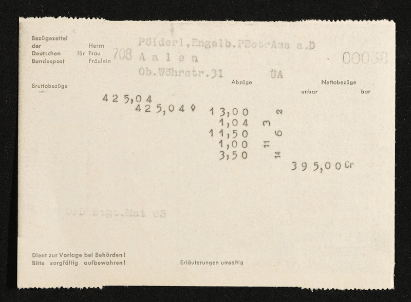 Lohnzettel, Postbetriebsassistent Engelbert Pölderl, Oberpostdirektion Stuttgart, Mai 1963