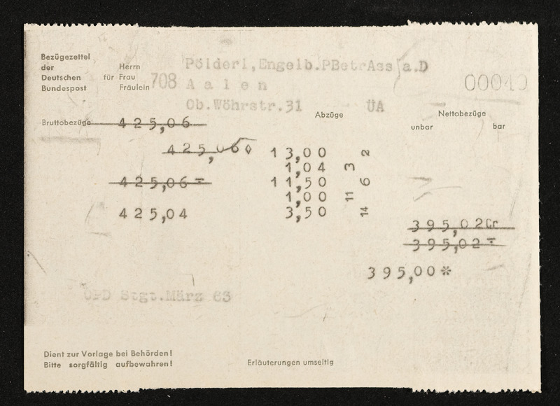 Lohnzettel, Postbetriebsassistent Engelbert Pölderl, Oberpostdirektion Stuttgart, März 1963