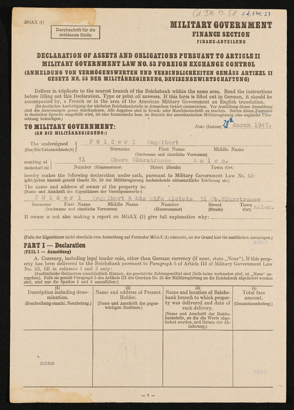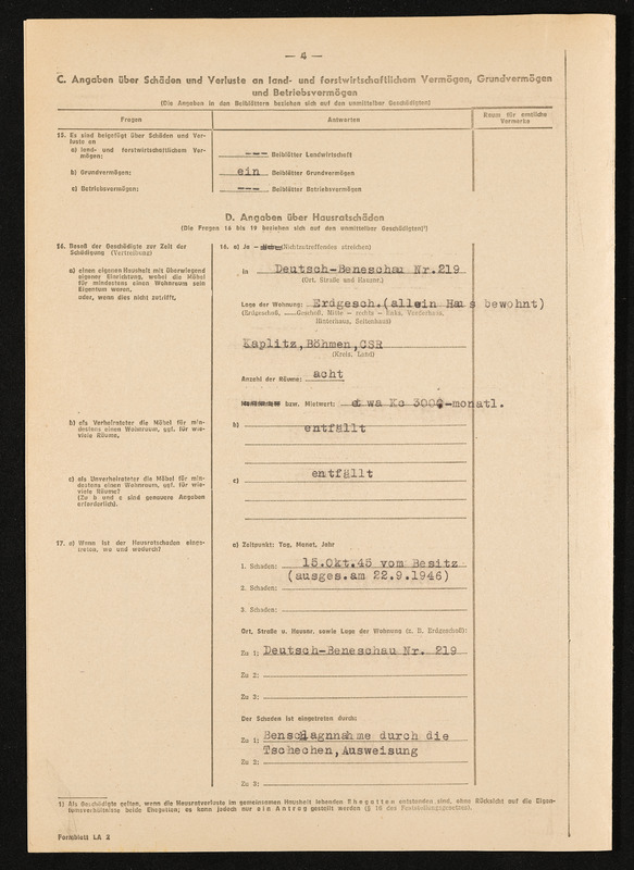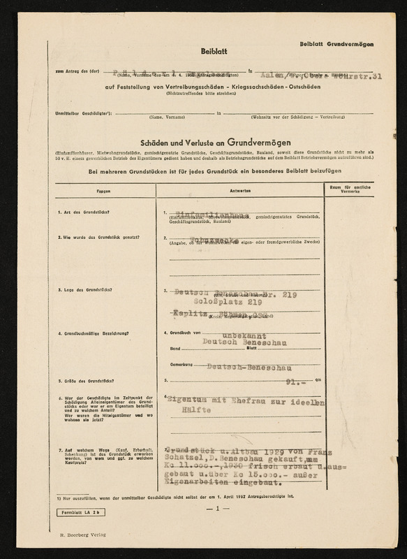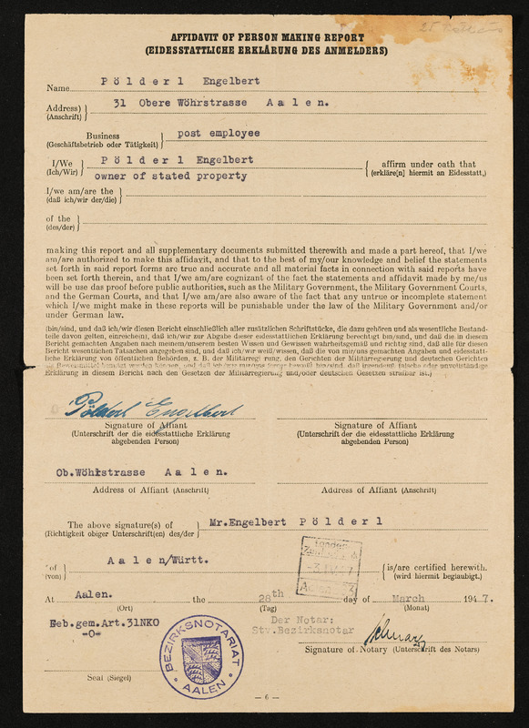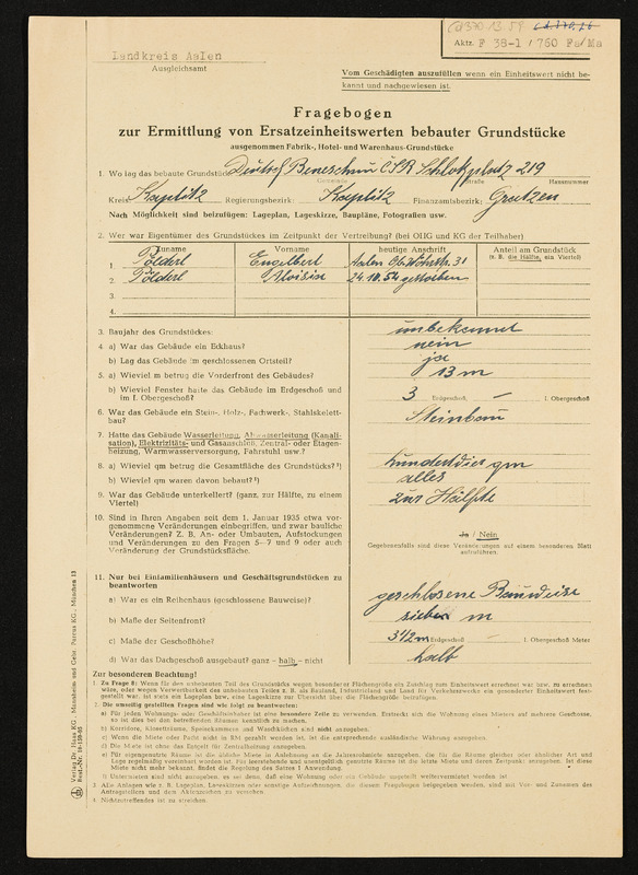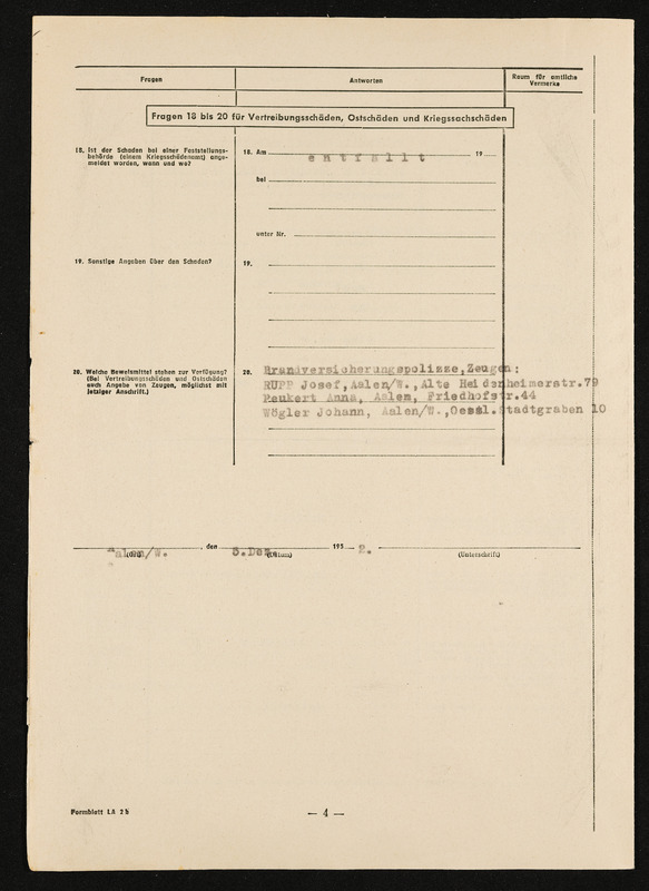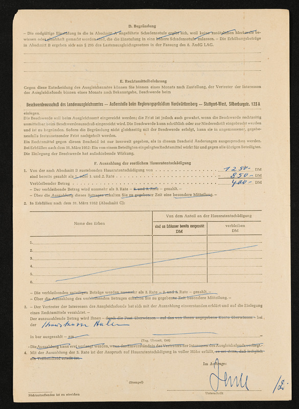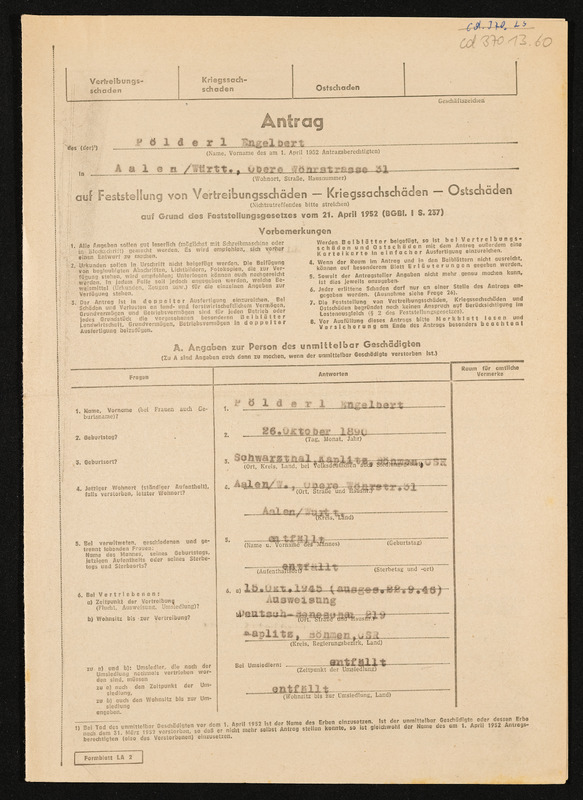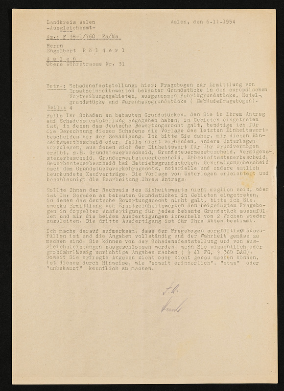 Bescheid über die Feststellung von Hausratsverlusten, die Zuerkennung von Hausratsentschädigung und die Gewährung von Hausrathilfe, Engelbert Pölderl, Landratsamt Aalen, Ausgleichsamt, 25. September 1956