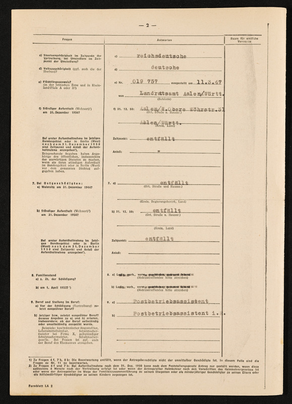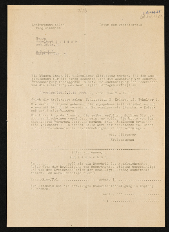 Mitteilung über Aushändigung des Bescheides und Auszahlung des bewilligten Betrages, Engelbert Pölderl, Landratsamt Aalen, Ausgleichsamt, erfolgt am 7. Juli 1959