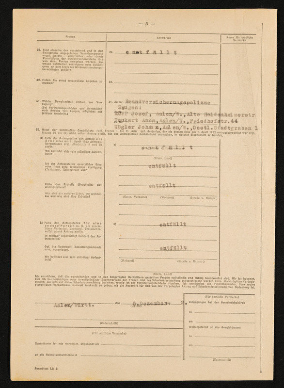 Bescheid über die Feststellung von Hausratsverlusten und über die Erhöhung der Hausratentschädigung, Engelbert Pölderl, Landratsamt Aalen, Ausgleichsamt, Aalen 17. April 1959