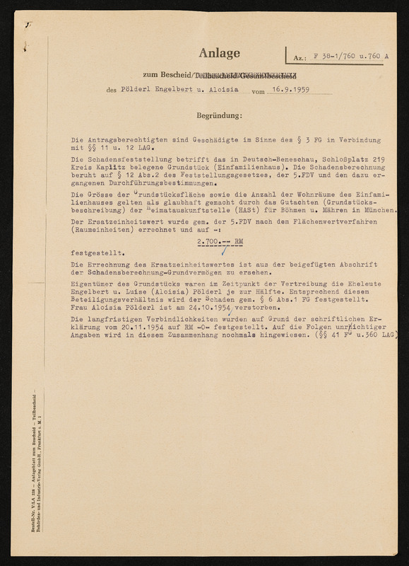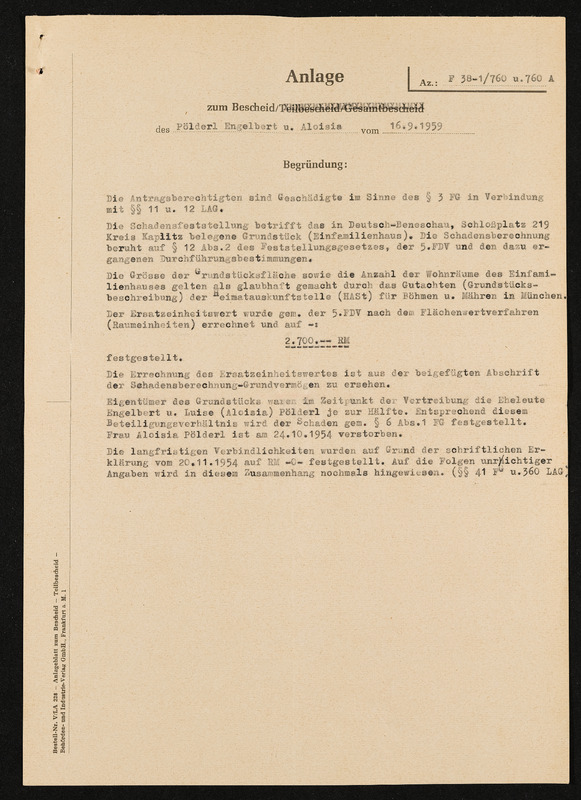 Bescheid über Zuerkennung von Hauptschädigung nach dem Lastenausgleichsgesetz, Aloisia Pölderl, Landratsamt Aalen, 19. Oktober 1960, Anlage 1 zum Bescheid, Schadensfeststellung vom 16. September 1959, Zusammenfassung der Schadensfeststellung