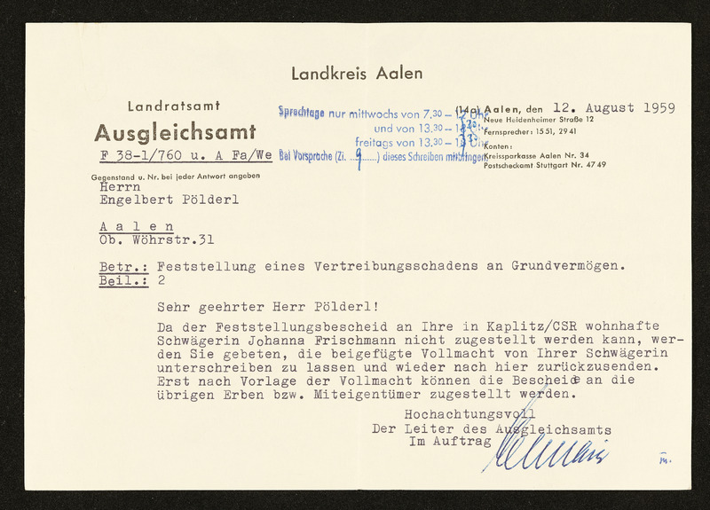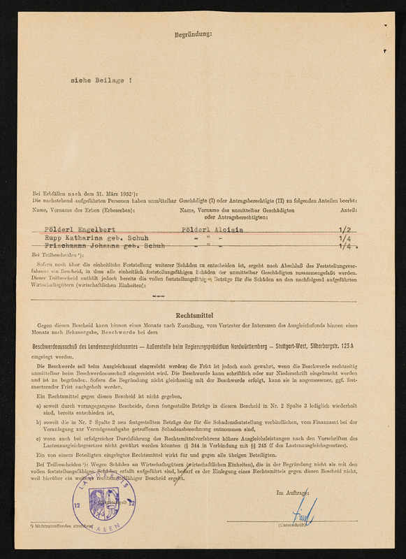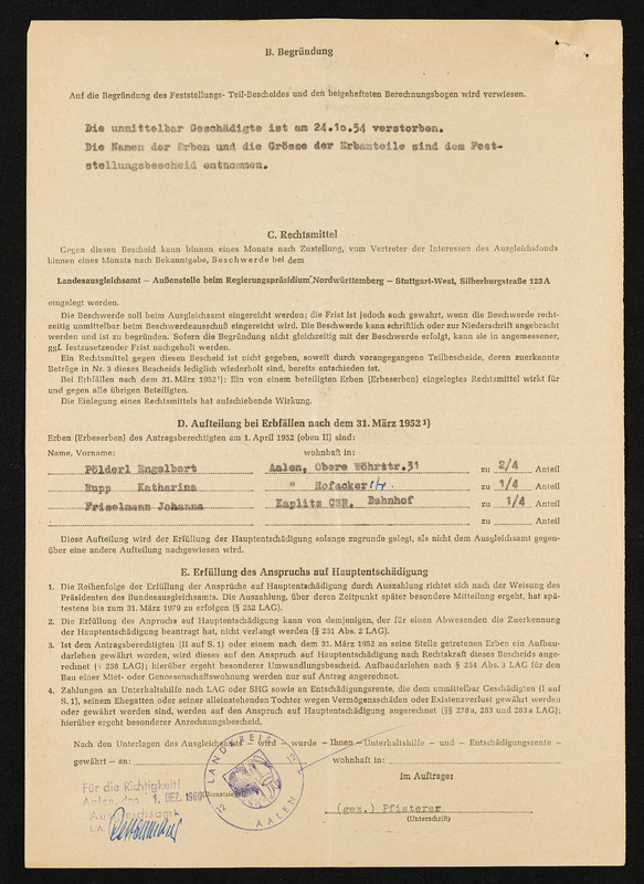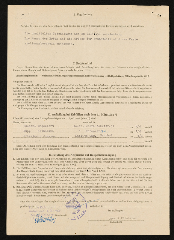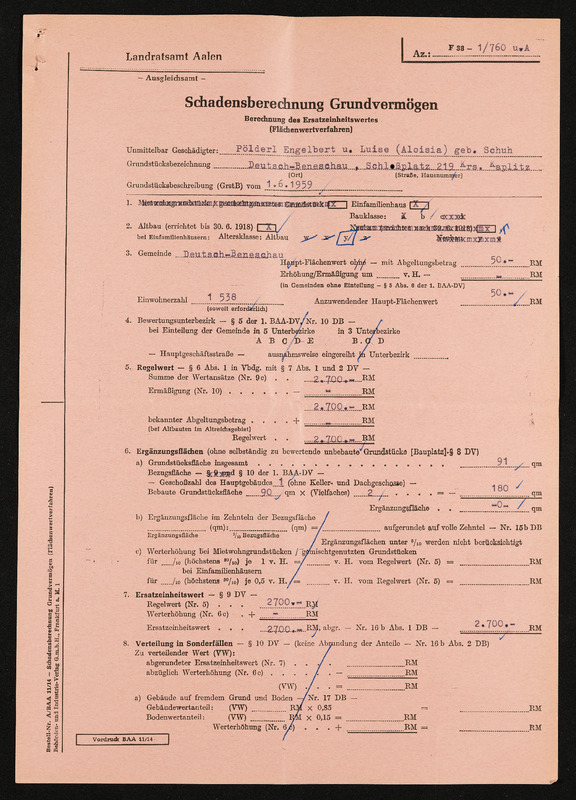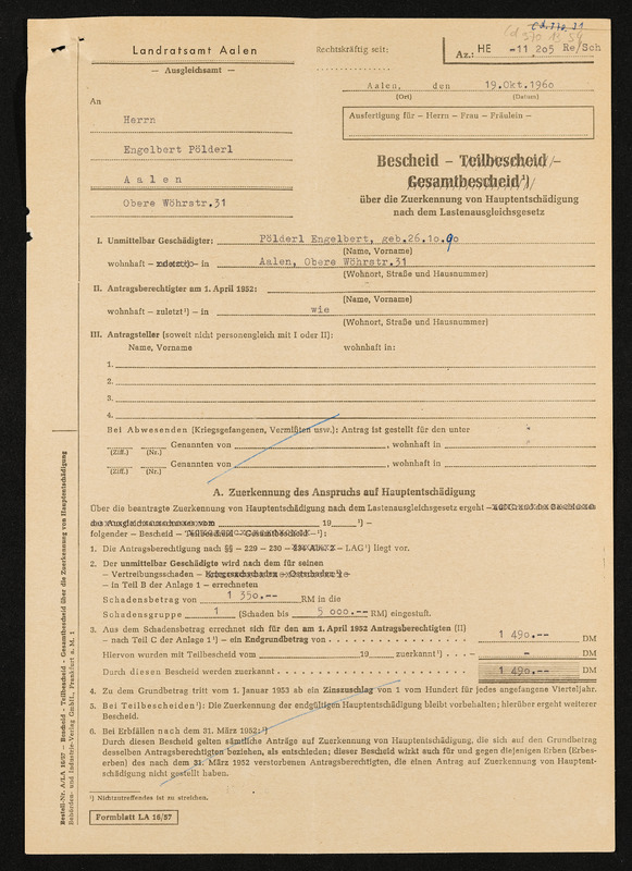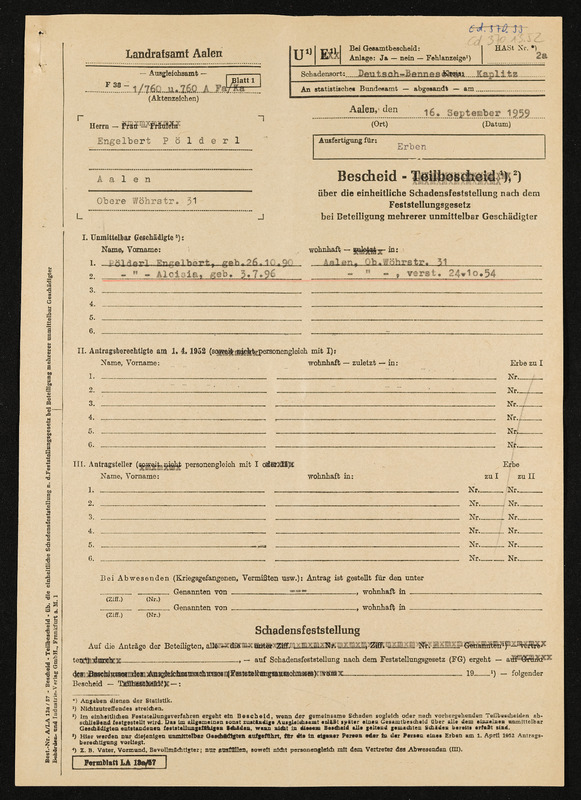 Bescheid über die einheitliche Schadensfeststellung nach dem Feststellungsgesetz für unmittelbar Geschädigte, Engelbert und Aloisia Pölderl, Landratsamt Aalen, 16. September 1959