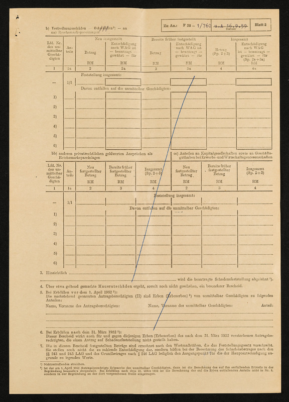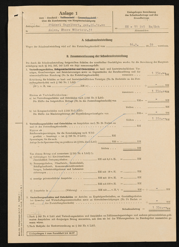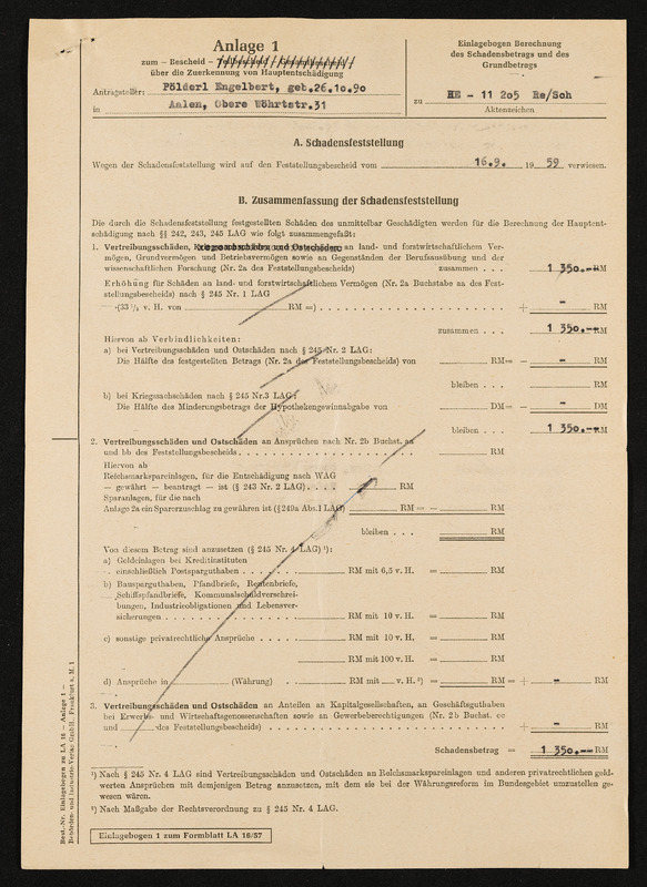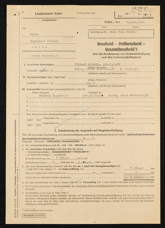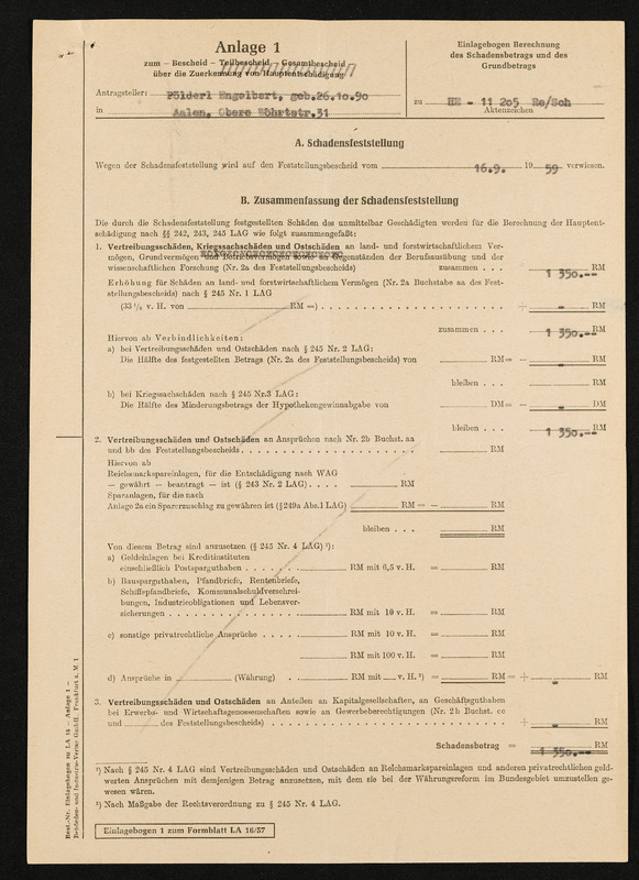 Bescheid über Zuerkennung von Hauptschädigung nach dem Lastenausgleichsgesetz, Engelbert Pölderl, Landratsamt Aalen, 19. Oktober 1960, Anlage 1 zum Bescheid, Schadensfeststellung vom 16. September 1959, Zusammenfassung der Schadensfeststellung