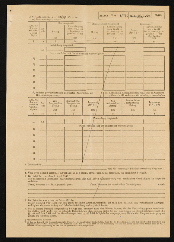 Bescheid über Zuerkennung von Hauptschädigung nach dem Lastenausgleichsgesetz, Johanna Frischmann, Landratsamt Aalen, 19. Oktober 1960, Anlage 1 zum Bescheid, Schadensfeststellung vom 16. September 1959, Zusammenfassung der Schadensfeststellung