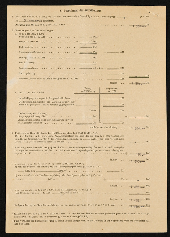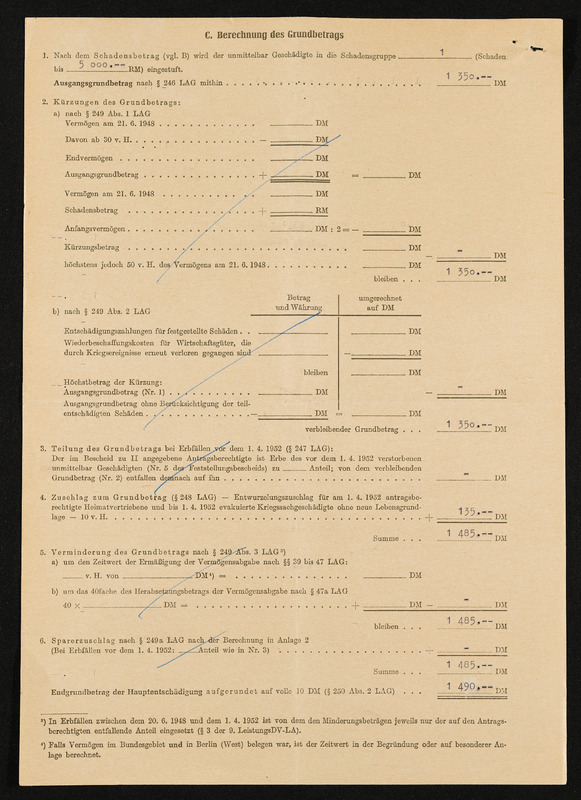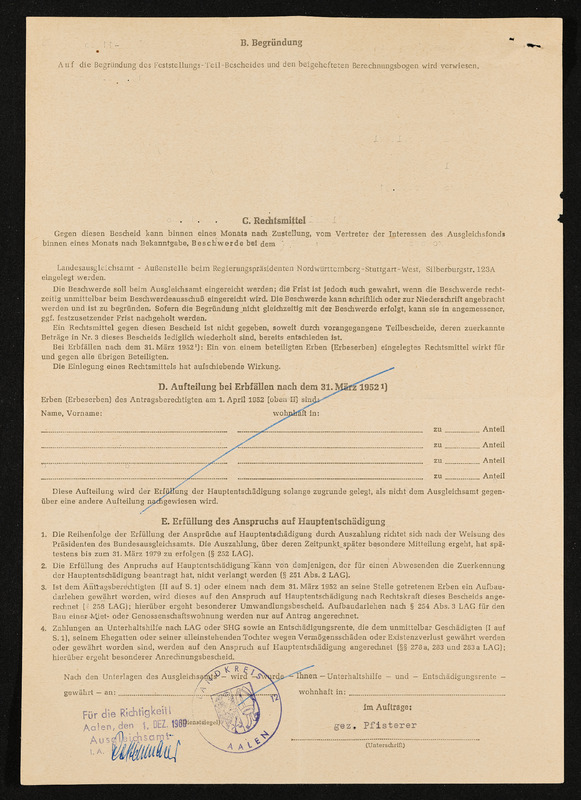 Bescheid über Zuerkennung von Hauptschädigung nach dem Lastenausgleichsgesetz, Engelbert Pölderl, Landratsamt Aalen, 19. Oktober 1960, Berechnung des Grundbetrages