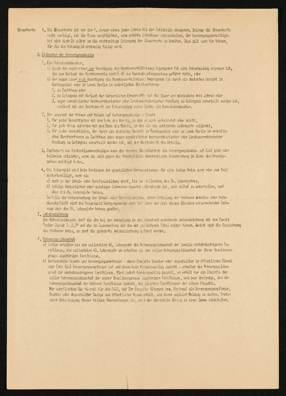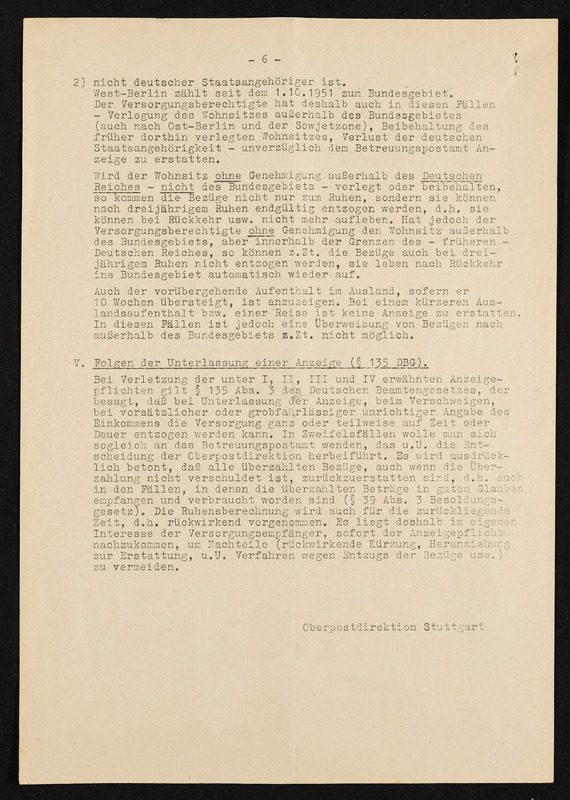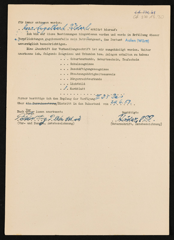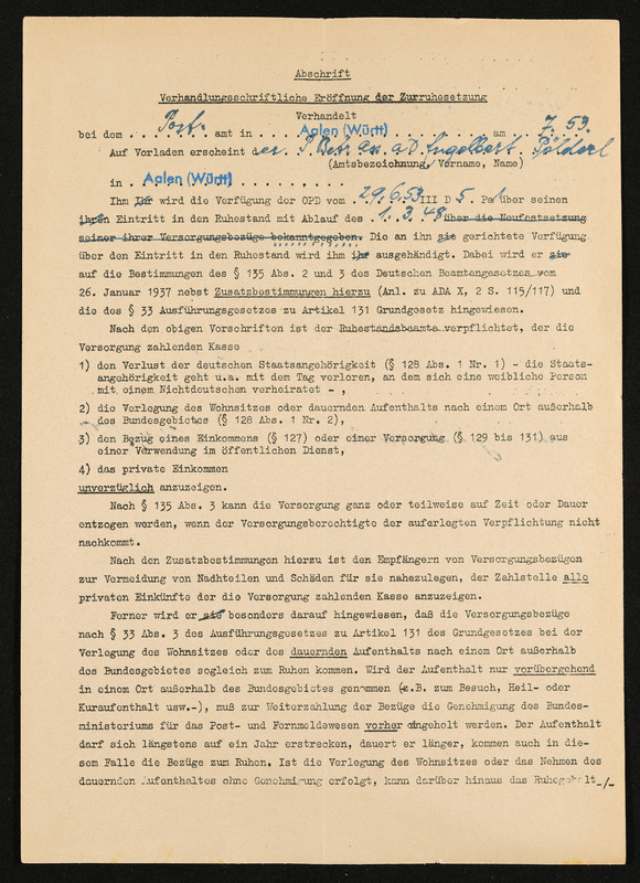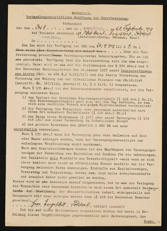 Schreiben der Oberpostdirektion an den Postbetriebsassistenten a.D. Engelbert Pölderl, Feststellung der Dienstunfähigkeit, Berechnung Ruhegehalt, Stuttgart, 29. Juni 1953