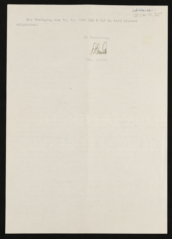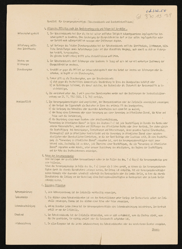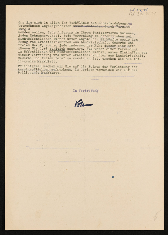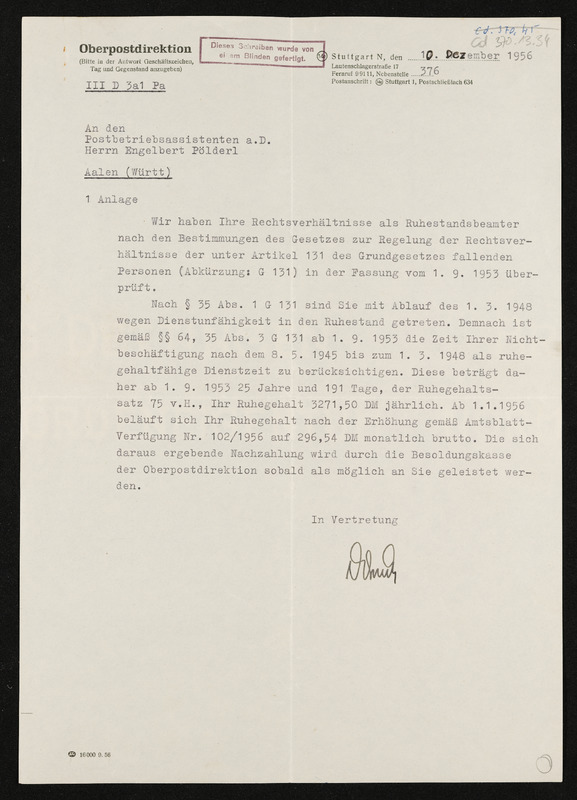 Schreiben der Oberpostdirektion an den Postbetriebsassistenten a. D. Engelbert Pölderl, Überprüfung der Rechtsverhältnisse als Ruhestandsbeamter, Stuttgart, 10. Dezember 1956