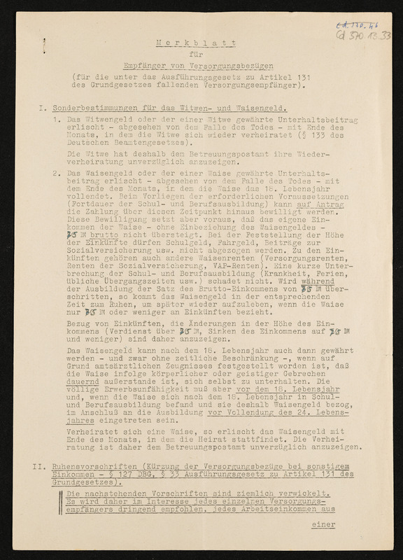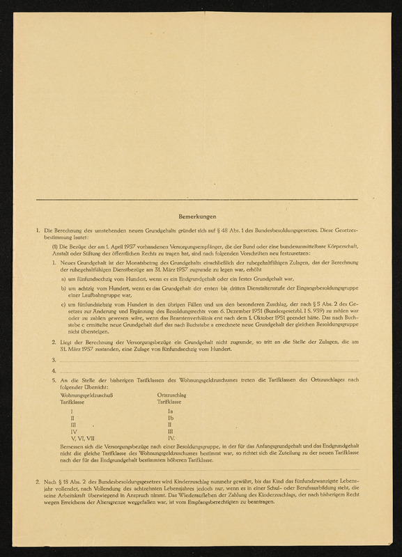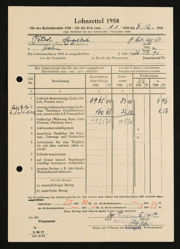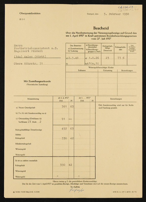 Bescheid über die Neufestsetzung der Versorgungsbezüge vom 27. Juli 1957, augestellt für Postbetriebsassistent a.D. Engelbert Pölderl, Stuttgart, 3. Februar 1958