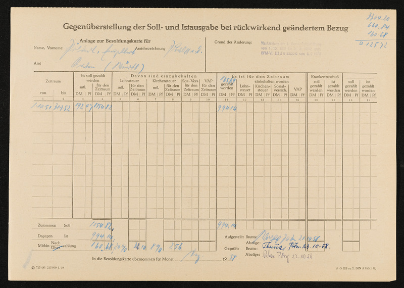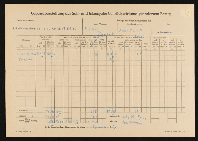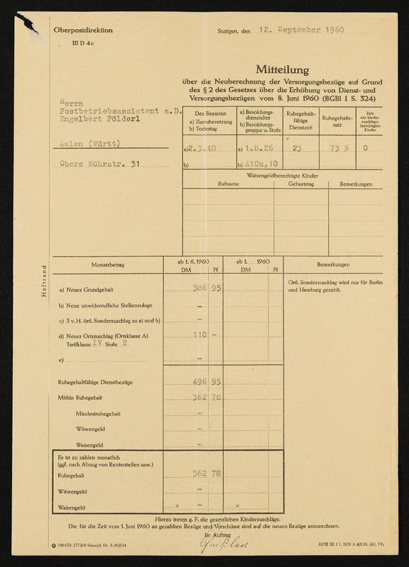 Mitteilung über die Neuberechnung der Versorgungsbezüge vom 8. Juni 1960, ausgetsellt für Postbetriebsassistent a.D. Engelbert Pölderl , Stuttgart, 12. September 1960