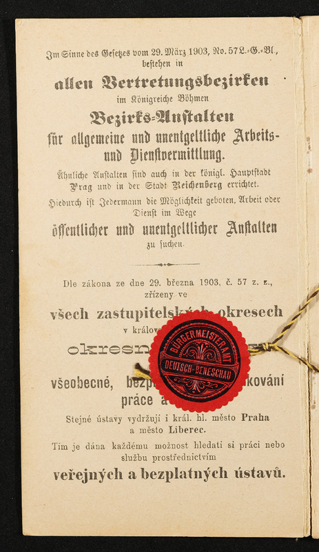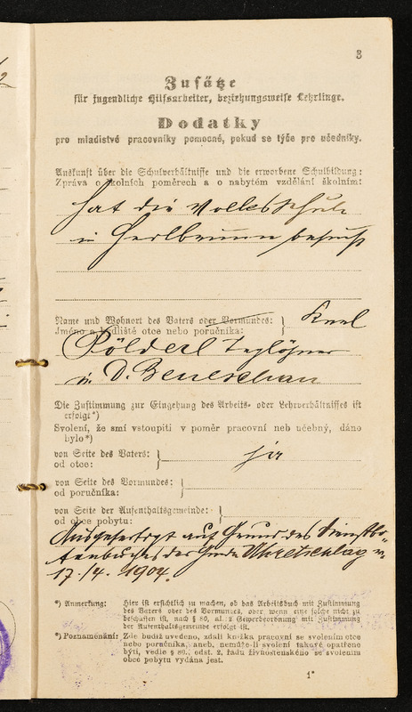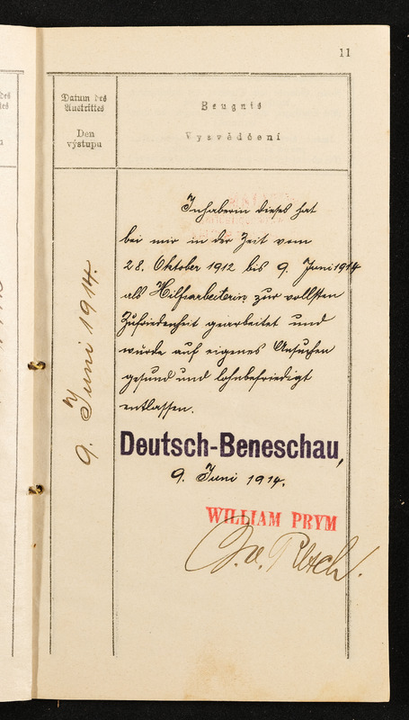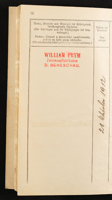 Arbeitsbuch der Hilfsarbeiterin Emilie Pölderl, beschäftigt in der Zwirnknopffabrik William Prym in Deutsch-Beneschau, 28. Oktober 1912 bis 9. Juni 1914