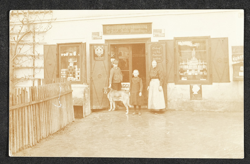 Diese Ansichtskarte zeigt die "Gemischte Warenhandlung von Josef und Josefa Straubinger" um 1906. Vor dem Geschäft steht Josefa Straubinger mit ihren beiden Kindern.