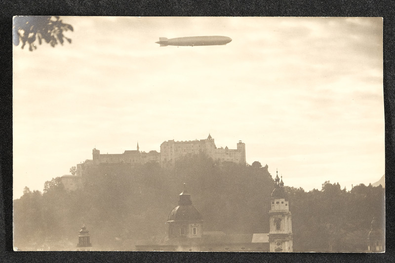 Diese Ansichtskarte ist eine Erinnerung an die Zeppelin-Rundflüge über Salzburg. Auf der Rückseite wurden diese handschriftlich vermerkt: erster Rundflug am 28. September 1928, zweiter Rundflug am 2. Mai 1929, dritter Rundflug am 21. Juni 1930 um 13:00 Uhr, vierter Rundflug am 14. September 1930 um 13:40 Uhr, fünfter Rundflug am 5. Mai 1931 um 13:30 Uhr