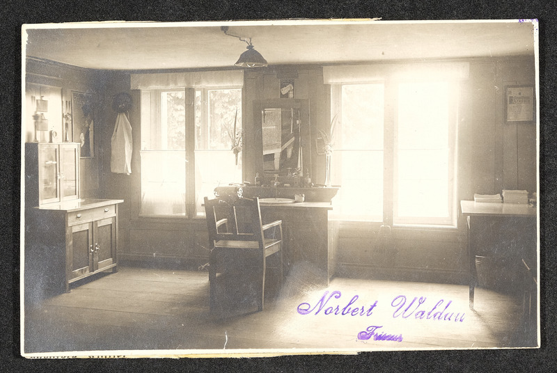 Ansicht eines Friseurgeschäftes in Sulz, das Norbert Waldau am 1. August (Jahr nicht bekannt) von Anton Zach übernommen hat. Auf Rückseite Zeitungsausschnitt über Geschäftsübernahme
