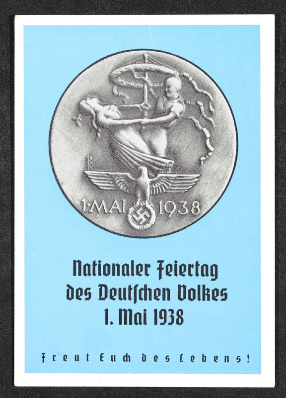 Mit dieser Ansichtskarte wird in Österreich der 1. Mai 1938 vom NS-Regime als "Nationaler Feiertag des Deutschen Volkes" beworben. Auf der Rückseite klebt ein ungestempeltes Postwertzeichen (Marke) im Wert von 6 Reichspfennig mit Aufdruck: "Ein Volk * Ein Reich Ein Führer 10. April 1938 Deutsches Reich"